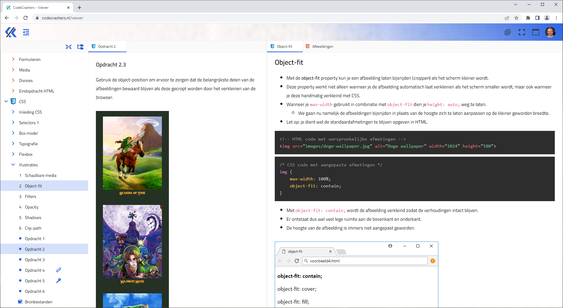 Bij het maken van opdrachten kan het handig zijn voor studenten om de benodigde theorie ernaast te houden om voorbeeldcode te kunnen bekijken of om de uitleg terug te lezen.